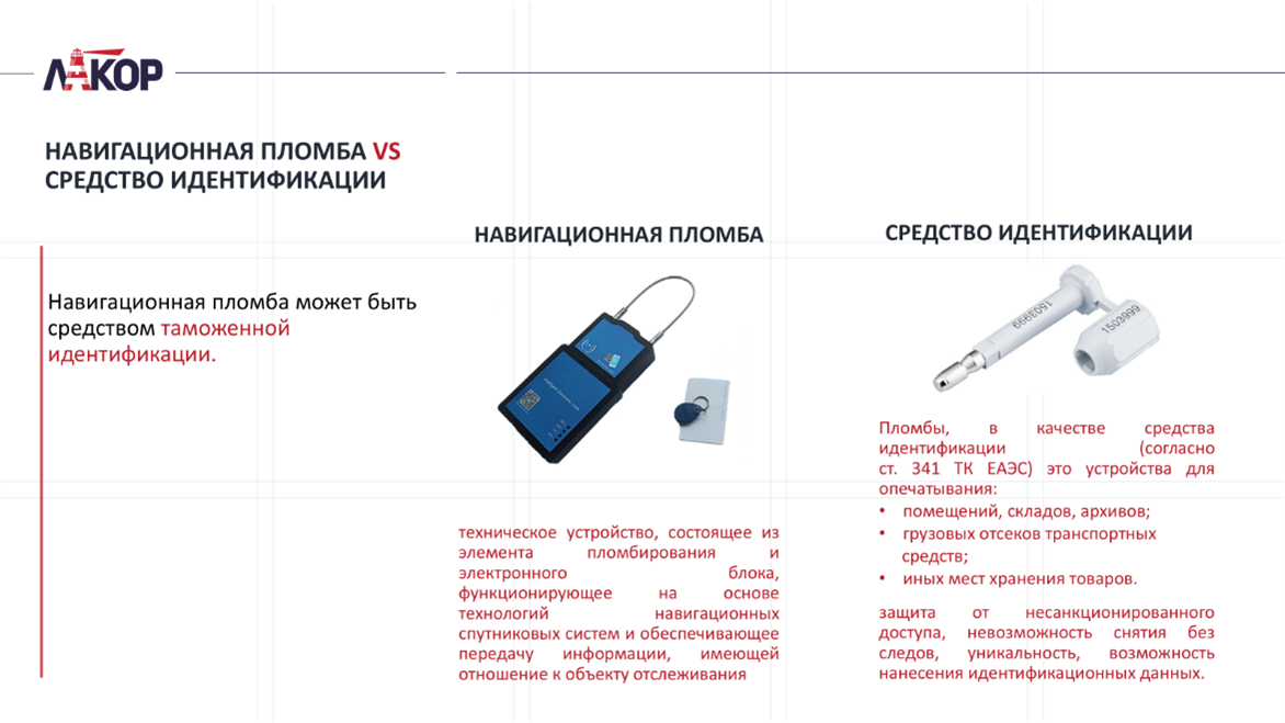 Как известно, в законодательстве ЕАЭС есть два понятия: навигационная пломба и средство идентификации. Давайте разберемся, чем они отличаются. Согласно определению навигационной пломбы, это: «Техническое устройство, состоящее из элемента пломбирования и электронного блока, функционирующее на основе технологий навигационных спутниковых систем и обеспечивающее передачу информации, имеющей отношение к объекту отслеживания.